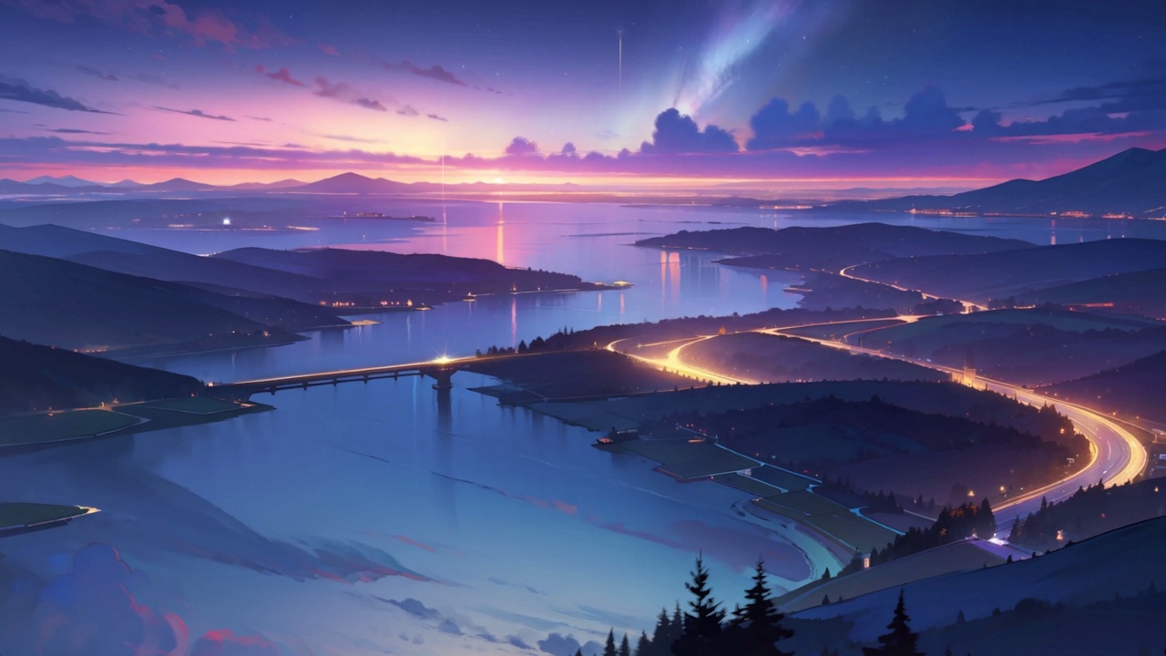 AI艺术、插画、云、樱桃树、湖泊、日落