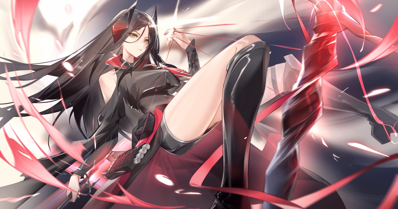 长发、大腿、眼角、动漫、动漫女孩、长角、武器、武士