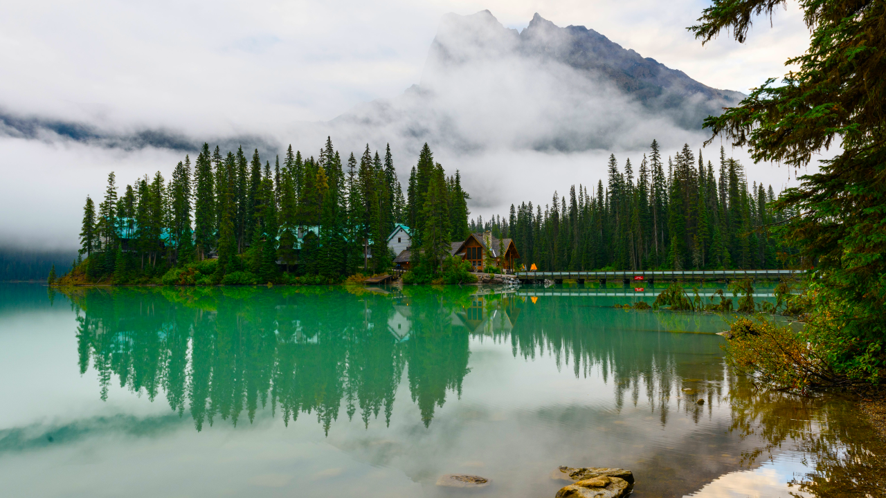 自然、景观树、木、云、松树、雾、水、湖泊、岩石、植物、桥梁、山脉