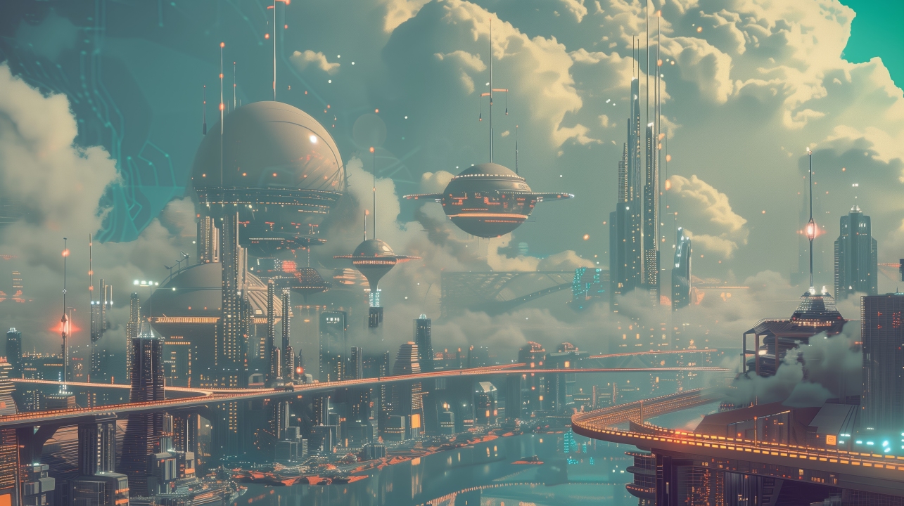 天空城市、未来派、科幻、电脑贴纸、4K贴纸