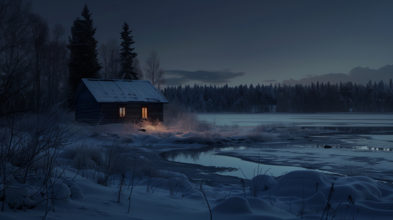 冬天、雪、夜晚、小屋、湖、树木