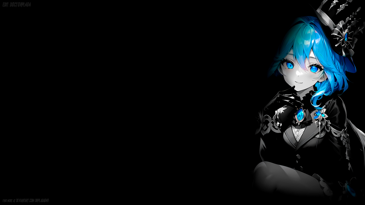 蓝色头发、蓝眼睛、微笑、长发、简单背景、动漫、动漫女孩、黑暗背景、帽子、手套、礼帽、宝石