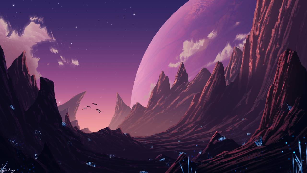 AI艺术、插画、风景、自然、行星、岩石、构造、鸟类、星星、山脉、生物发光、森林