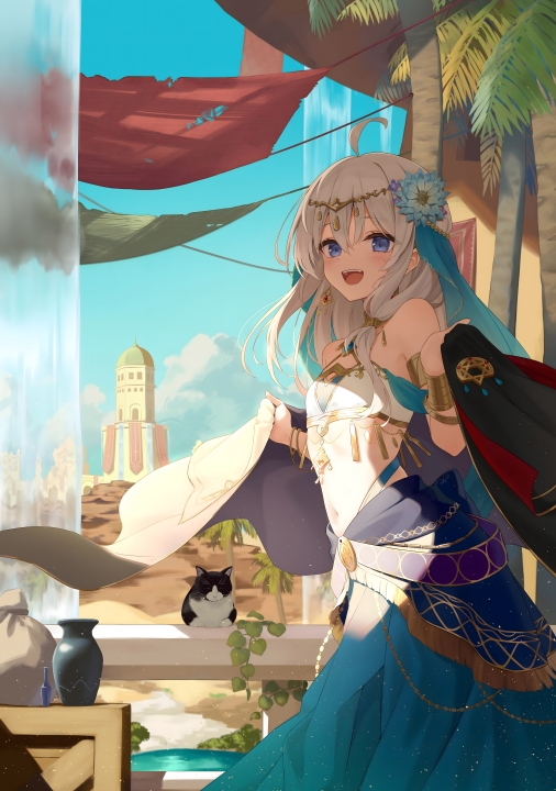 白发、蓝眼睛、灰色头发、动漫、女孩、耳环、云、天空、猫、瀑布、水、花瓶、阳光、棕榈树