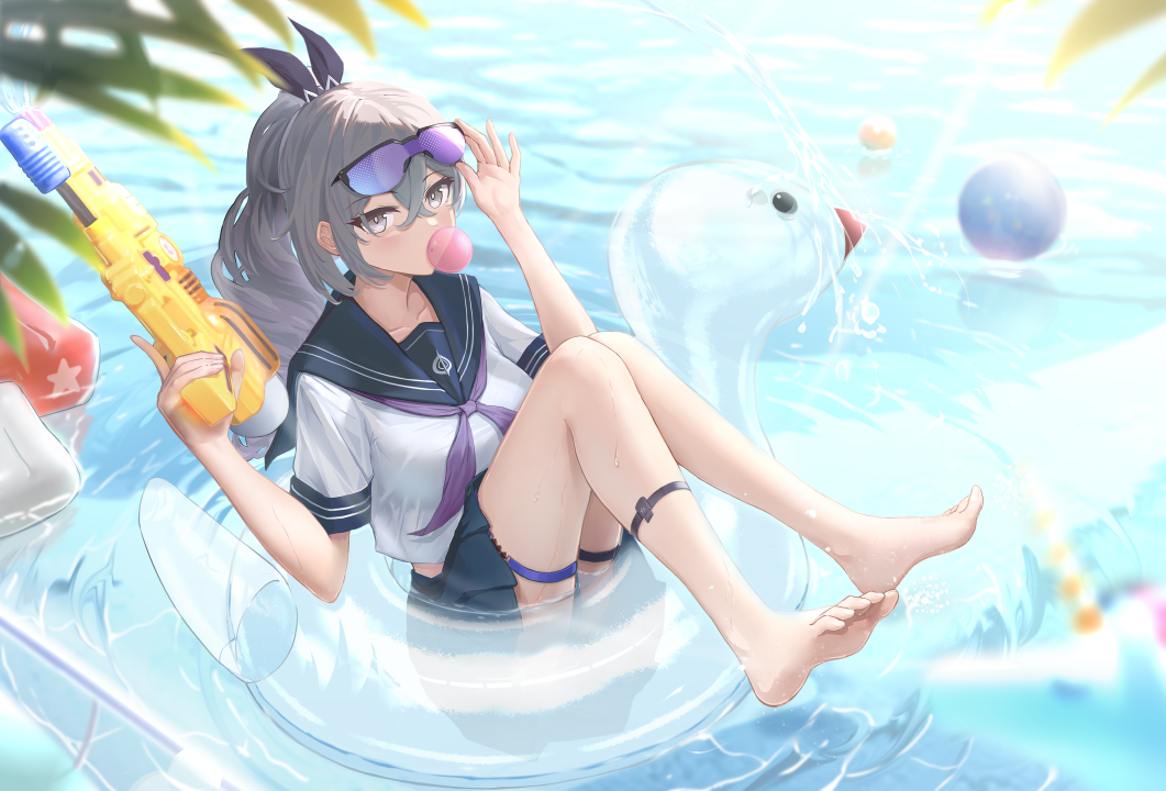 电子游戏女孩、女学生、动漫女孩、银狼、泳池、校服、水枪、泡泡糖、户外