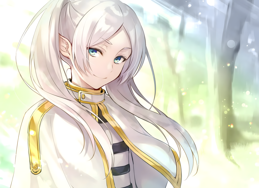 白发、长发、蓝眼睛、微笑、动漫女孩、尖耳朵、树