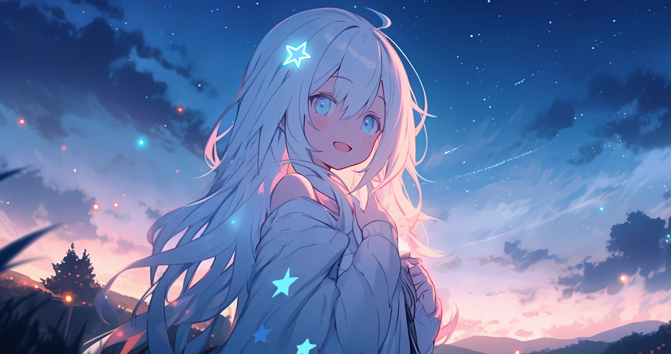 微笑、留着长发、动漫女孩、明星眼睛、饮料、帽子、双色调头发、星野爱