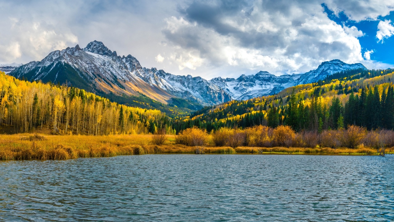 自然、风景、山脉、湖泊、秋天、森林、天空、云、水、雪
