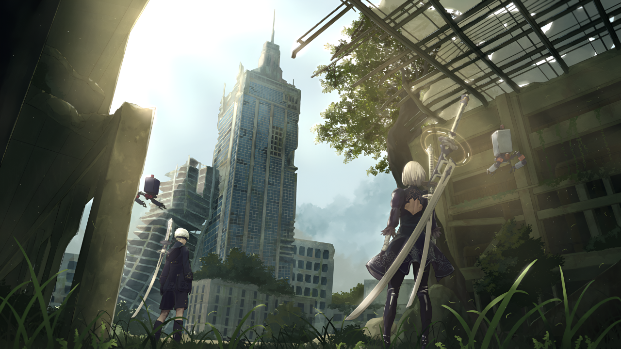 尼尔、树叶、动漫、男孩、女孩、机器人、阳光、剑、云、建筑、蒙眼