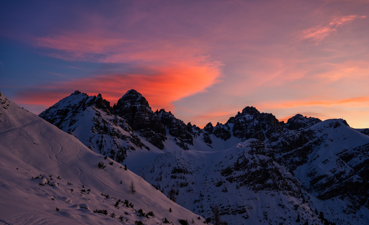 自然、风景、山脉、云、雪、冬天、岩石、粉红色的云、天空、日落