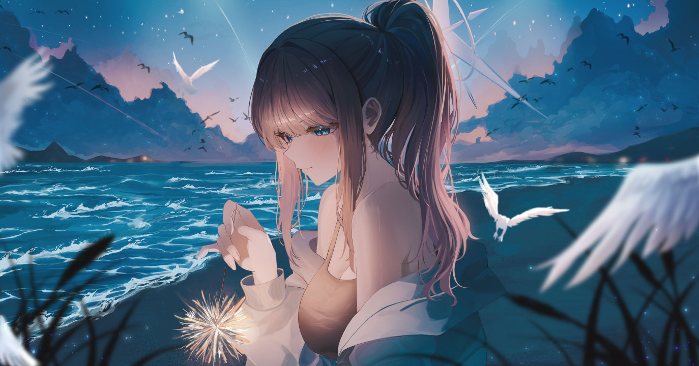 蓝色、眼睛、户外、女人、马尾辫、长发、蓝色档案、海滩、鸟、背心、云、天空、动漫、女孩、烟花、沙滩、海边、海鸥、仙女棒