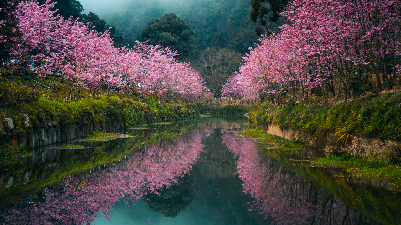 自然、景观、树木、植物、草、水、倒影、森林、山脉、樱花、台湾