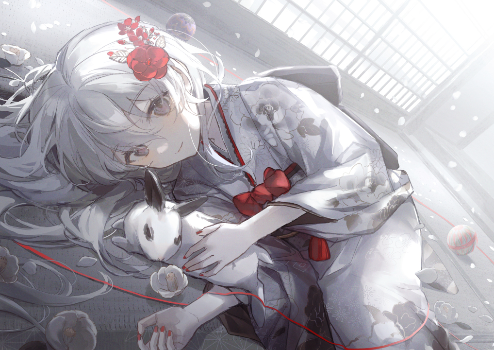 灰色的眼睛、微笑、长发、动漫女孩、和服、花、银发、兔子