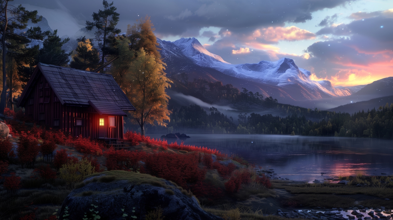 AI艺术、水、插画、小屋、湖泊、山脉