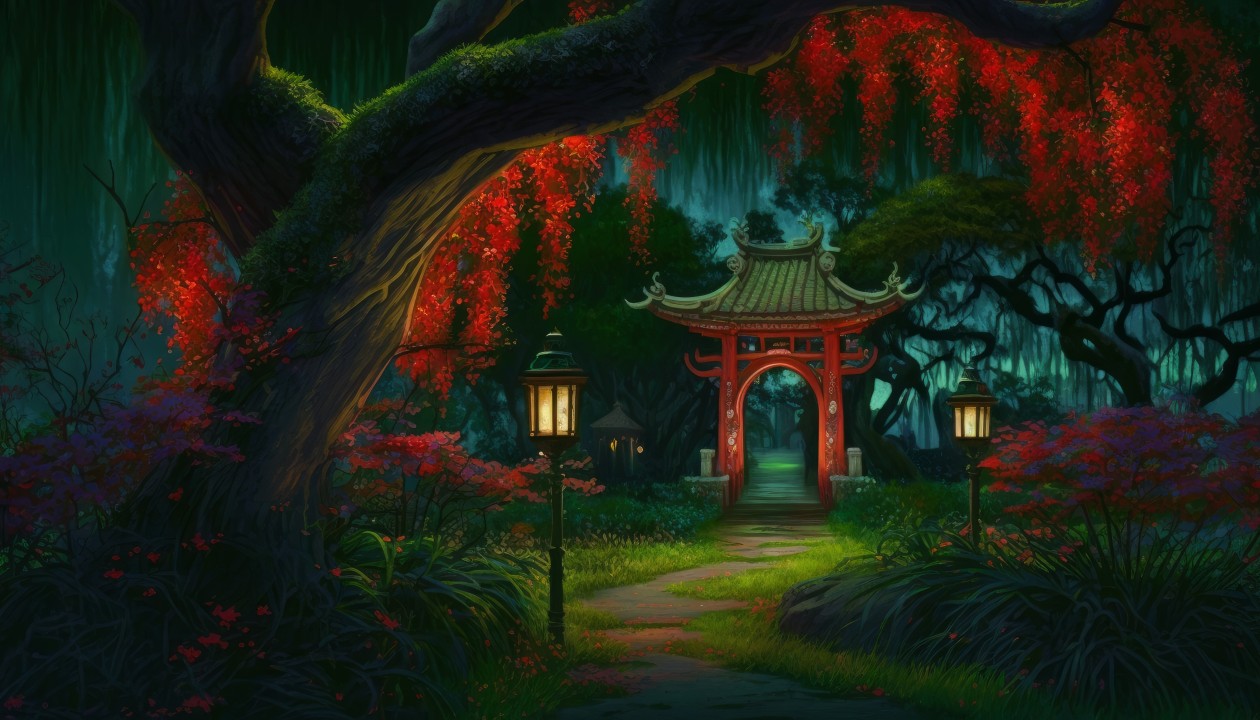 艺术、插图、路径、森林、灯笼、亚洲建筑