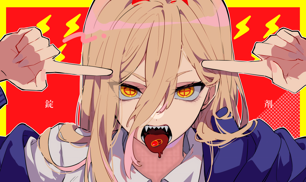 吐舌、金发、张嘴、力量、电锯人、动漫、女孩、药丸、黄眼睛