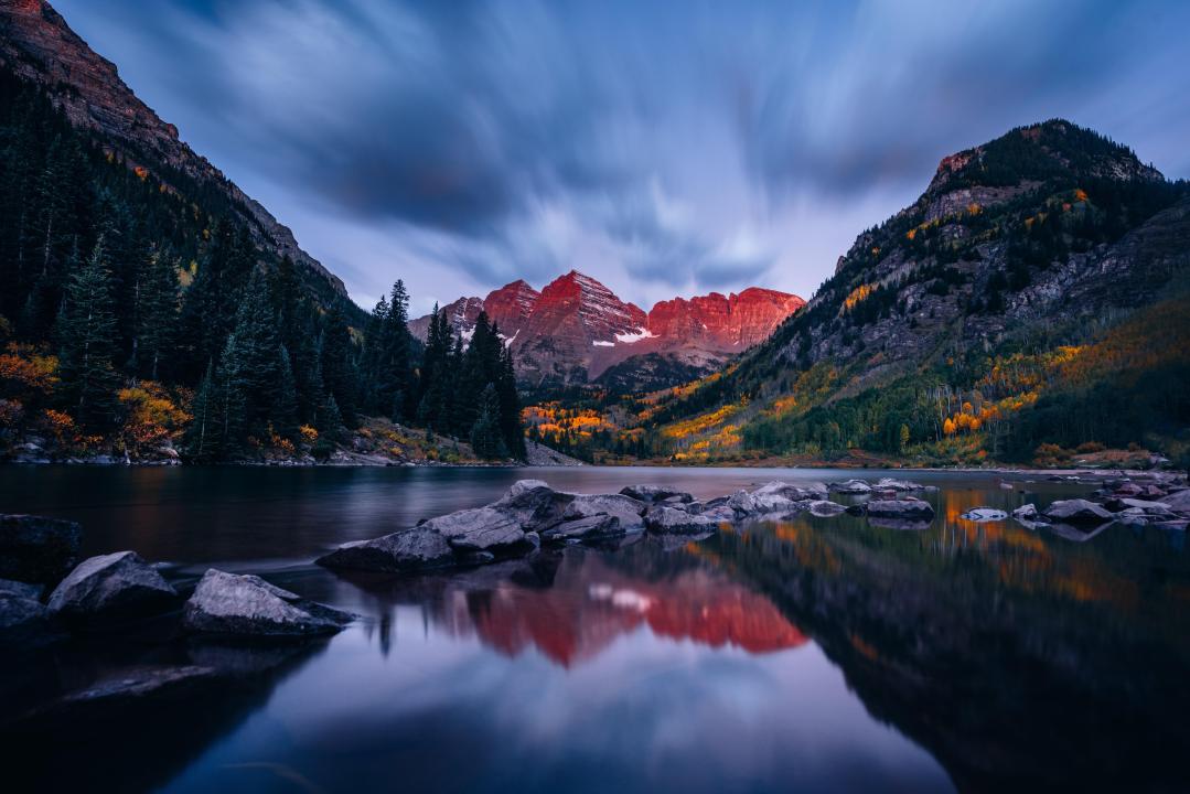 日落时分的山景与湖泊