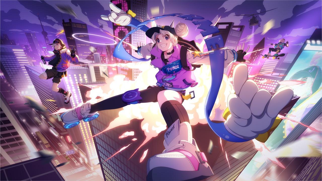 微笑、动漫、女孩、男孩、银发、科幻、城市、夜晚、棒球帽、滑板、插图