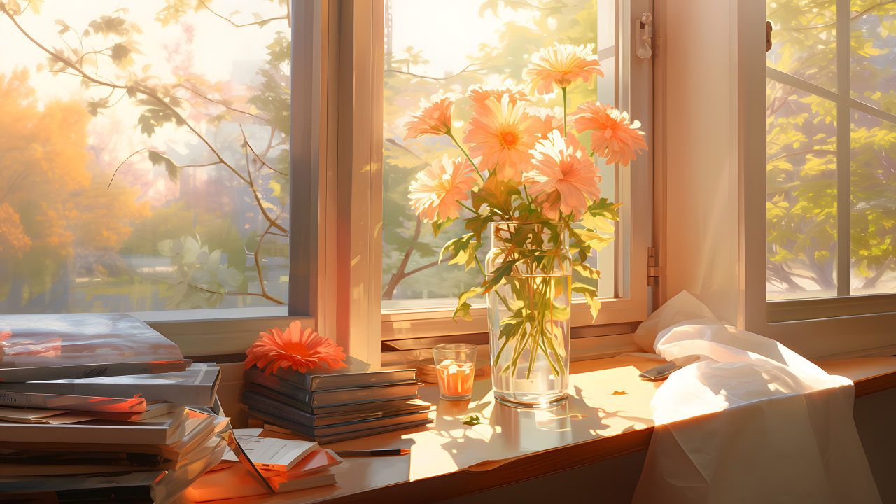 阳光、花园、书籍、鲜花、窗台、AI艺术