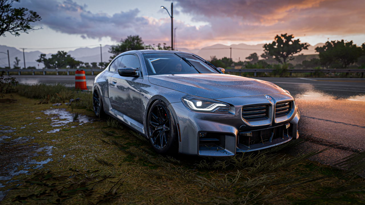 游戏、BMW、宝马、漂移、日落、反射、地平线、极限竞速、雨、草、天空、道路、云、汽车