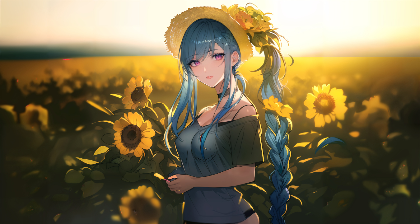 动漫女孩在向日葵田中