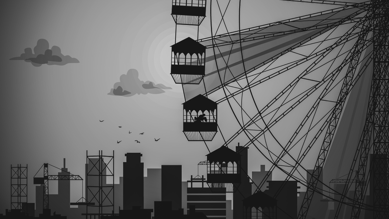 插图、城市、太阳、剪影、单色、摩天轮、城市景观、轿跑车、天空、鸟类、动物