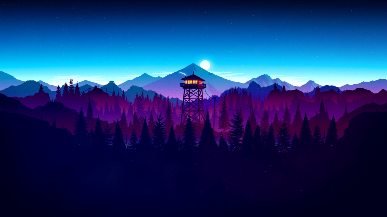 紫色山脉之夜:寂静森林中的守望塔