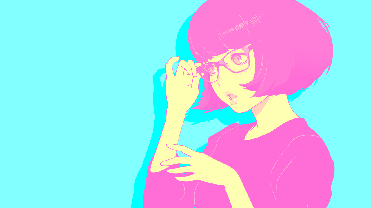短发、眼镜、五颜六色、汽波、简单背景、动漫、女孩