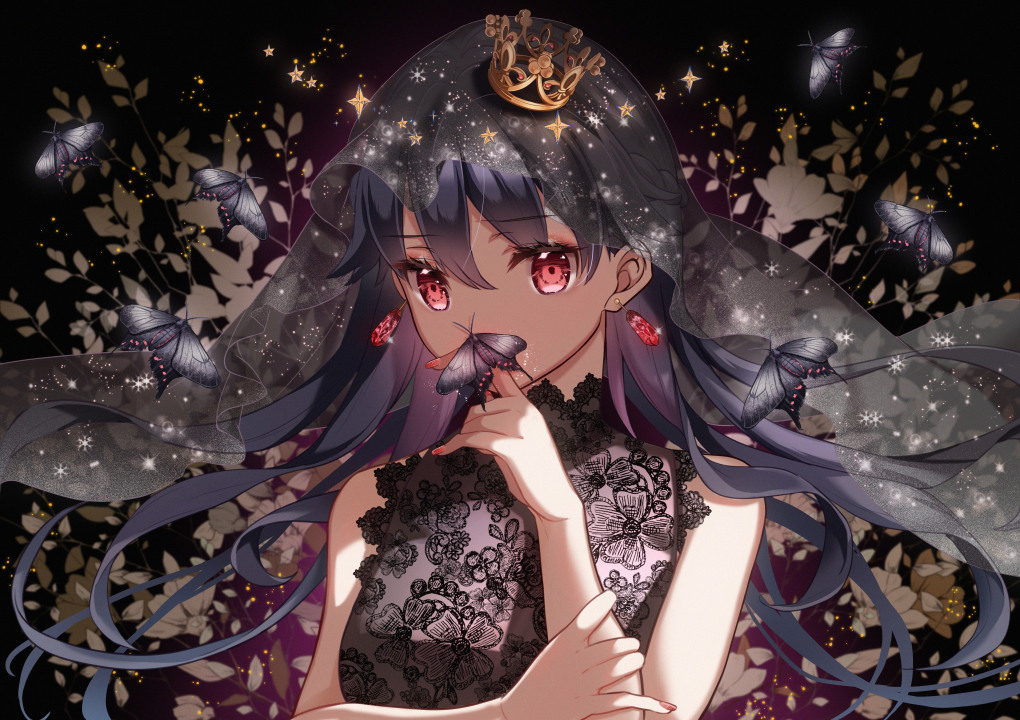 原创人物、长发、深色头发、红眼睛、动漫女孩、动漫、面纱、连衣裙、蝴蝶