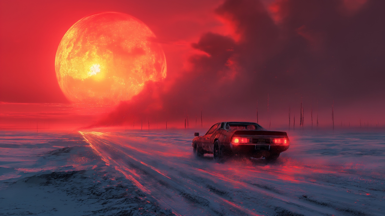 AI艺术、插画、汽车、驾驶、雪景、云、月亮、红色