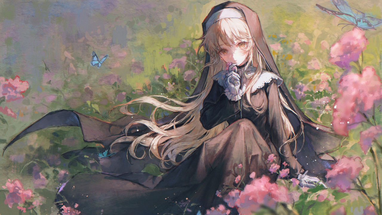 抹茶、修女、金发、动漫、女孩、AI艺术、鲜花