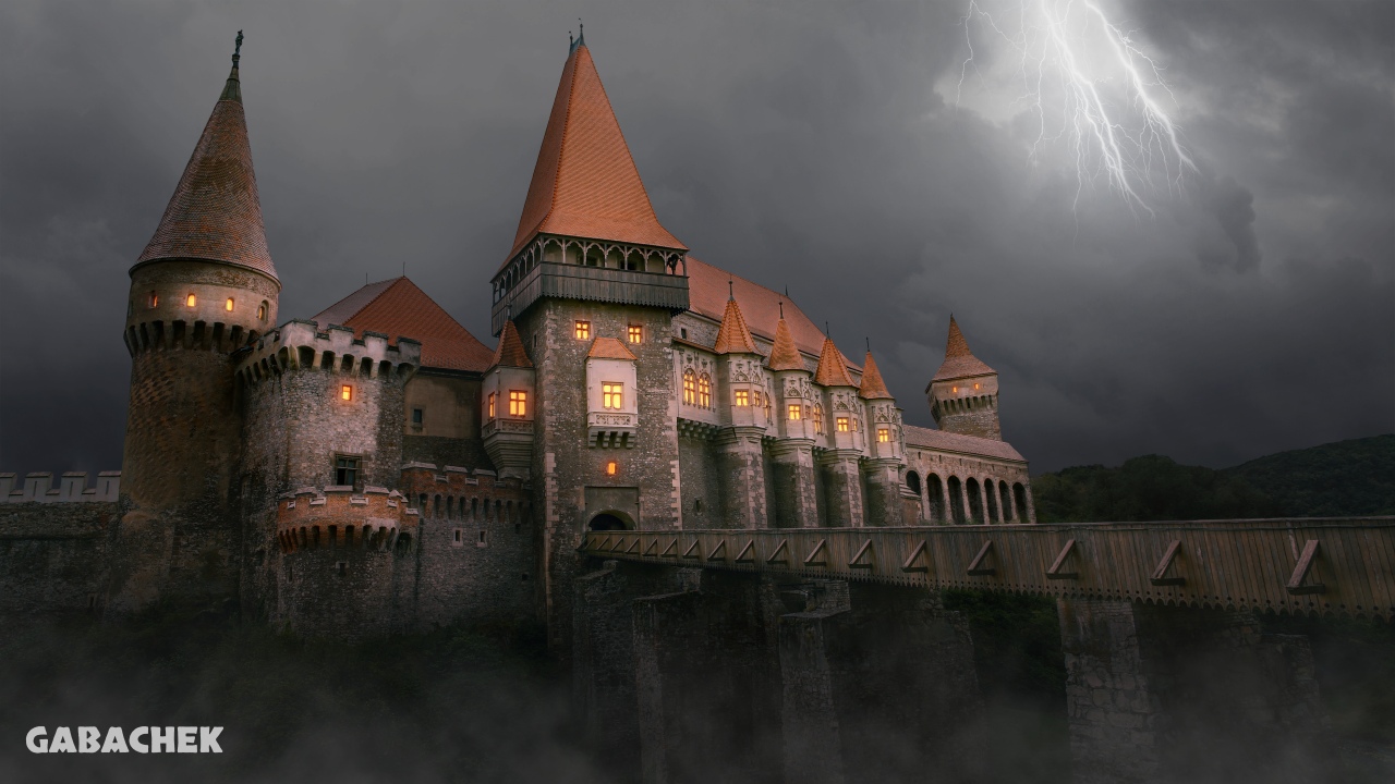城堡、建筑、森林、夜晚、自然、闪电、云、塔、桥、数字艺术、罗马尼亚