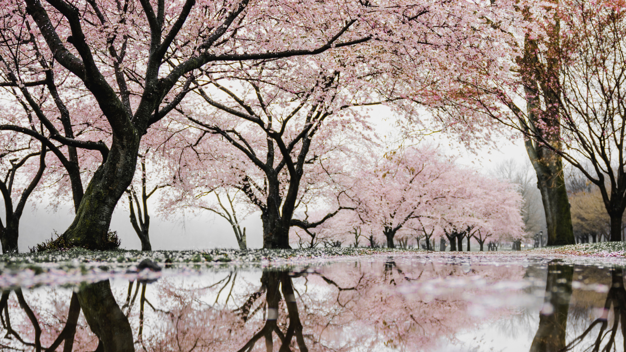 樱花、倒影、树、花、水、自然、春天