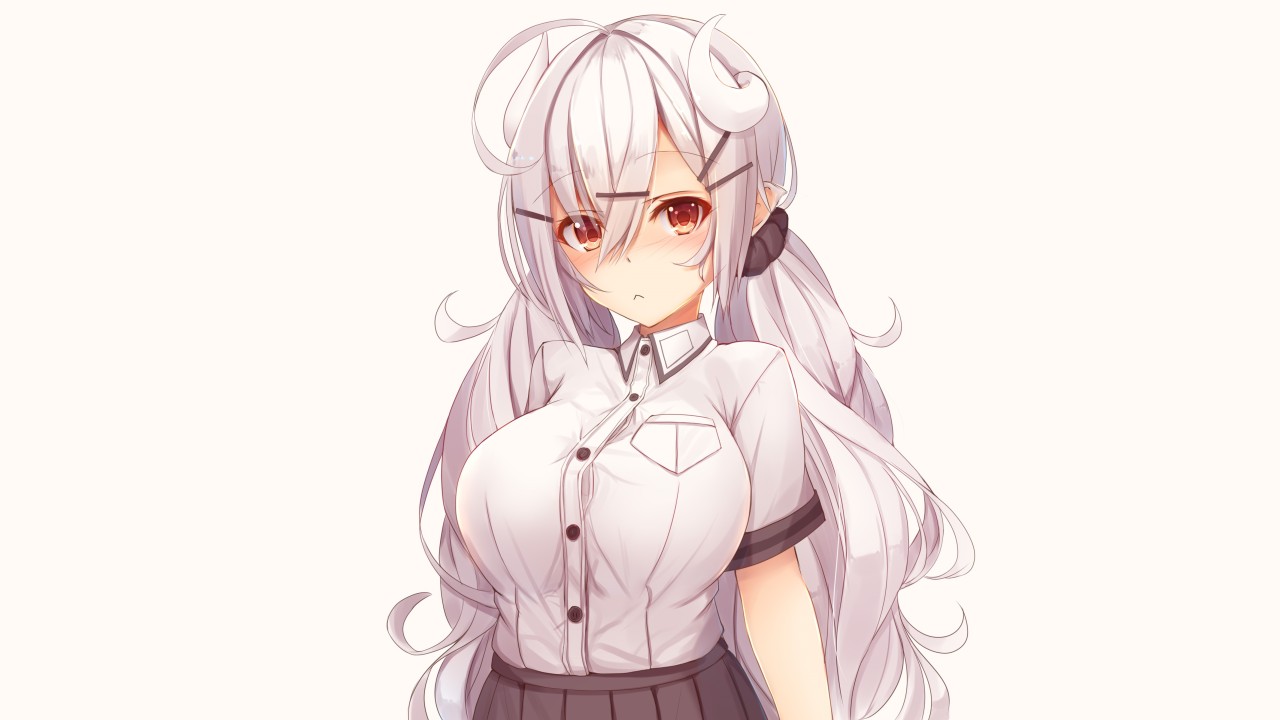 原创、人物、红眼睛、动漫、女孩、角、灰色头发、连衣裙