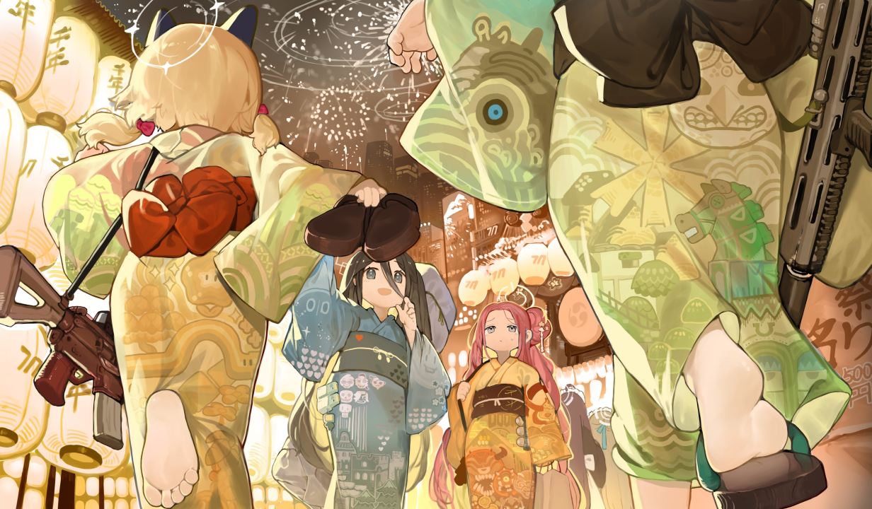女孩、汗水、动漫、蓝色档案、浴衣、和服、动漫女孩、烟花、灯笼、灯光、跑步、双胞胎、枪、集会
