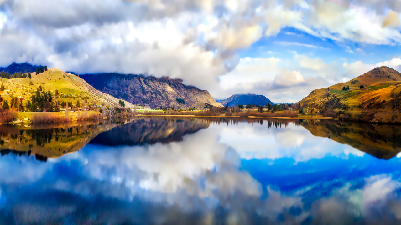 风景、新西兰、自然、水、反射、山、云、天空
