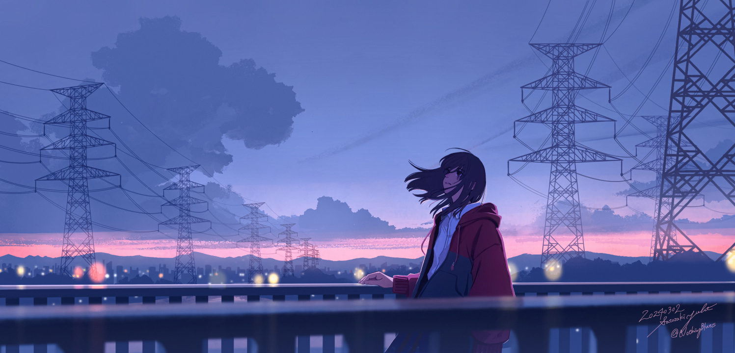 黄昏下的电力线与动漫人物
