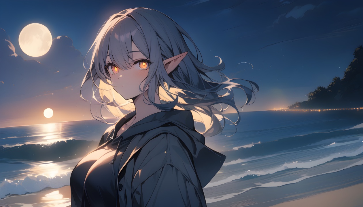 动漫女孩、人工智能艺术、月光、海滩、尖耳朵