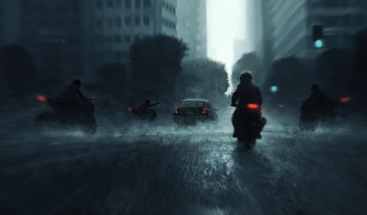 摩托车、汽车、运动模糊、AI艺术、雨中的摩托车