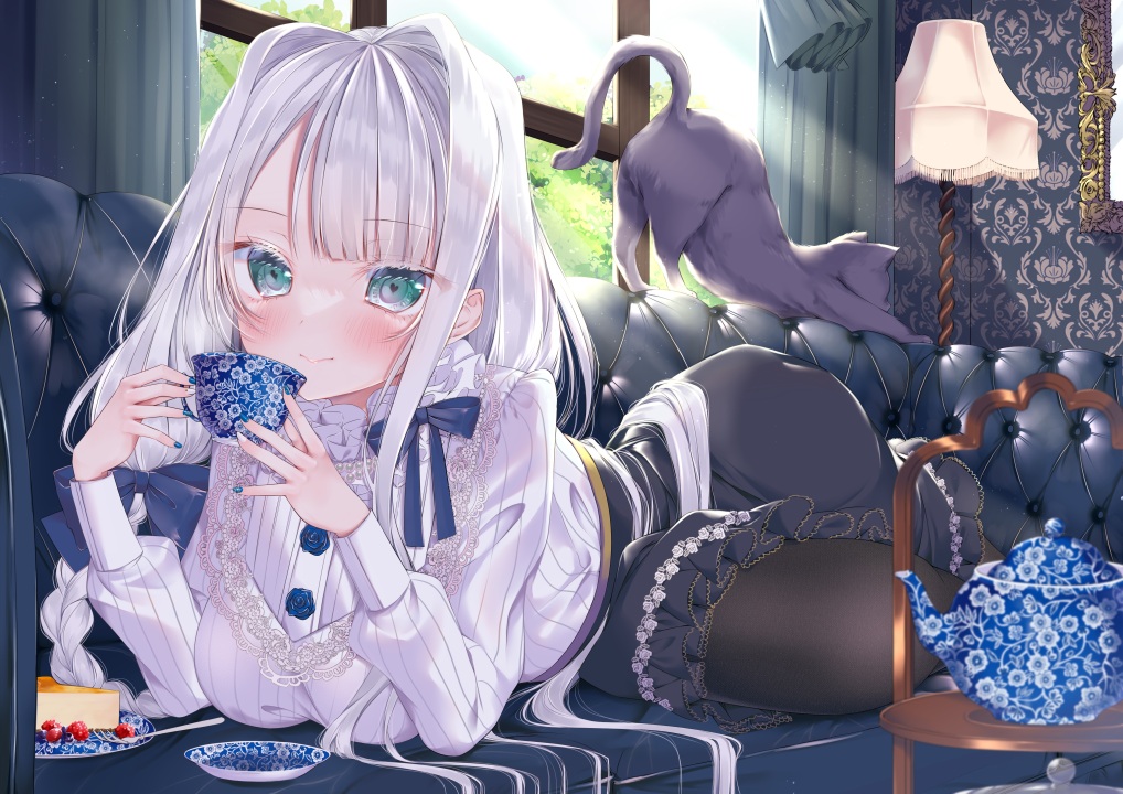 白发、蓝眼睛、长发、沙发、动漫、动漫女孩、茶、猫、心眼、蛋糕