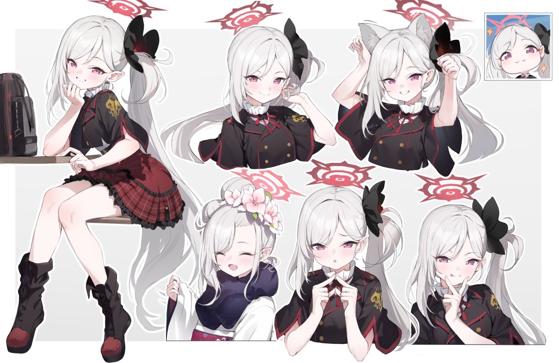 白发、长发、马尾辫、侧马尾、蔚蓝档案、白色背景、动漫女孩、兽耳、制服