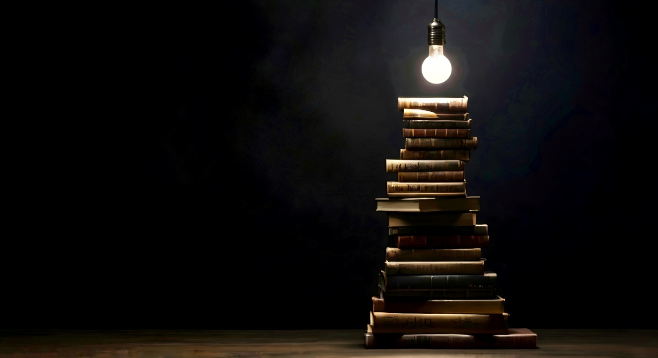 书、堆书、深色背景、灯泡、人工智能艺术
