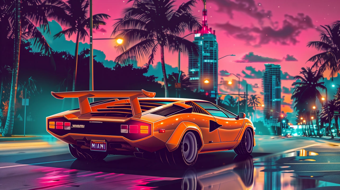 人工智能艺术、插画、兰博基尼Countach、棕榈树、波纹、橙色
