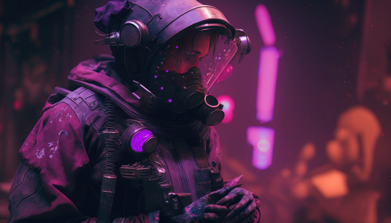 女性、插图、赛博朋克、紫色、蓝色、AI艺术、艺术、女人、防毒面具、末日