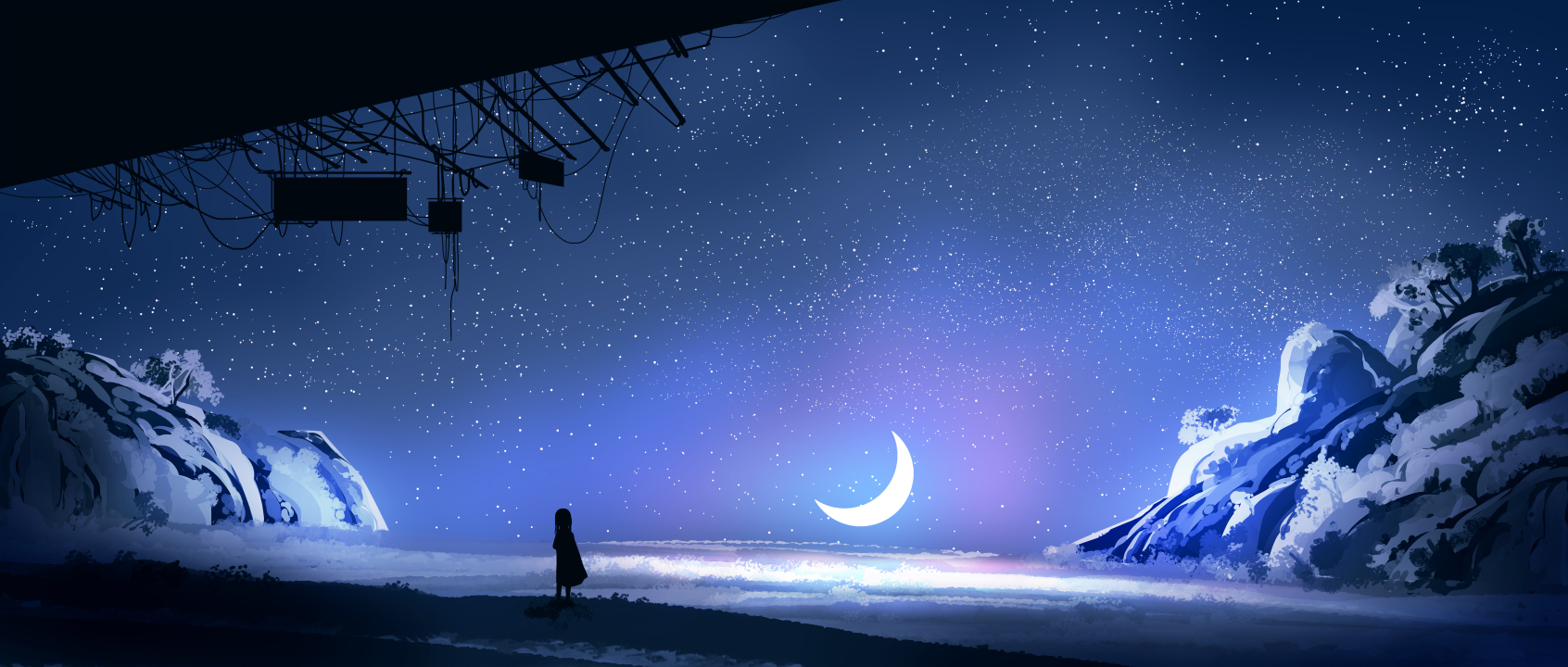 优雅、数字艺术、艺术品、插画、极简主义、夜晚、星星、月亮、夜景、风景、自然、星夜、新月、星空