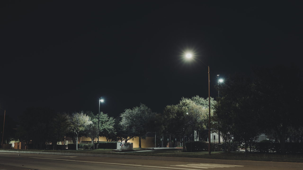 城市、路灯、树木、户外、现代、夜、黑暗