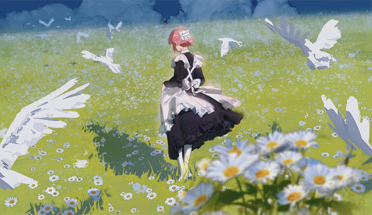 动漫、动漫女孩、女仆装、鸟、花、女仆、草、领域、围裙