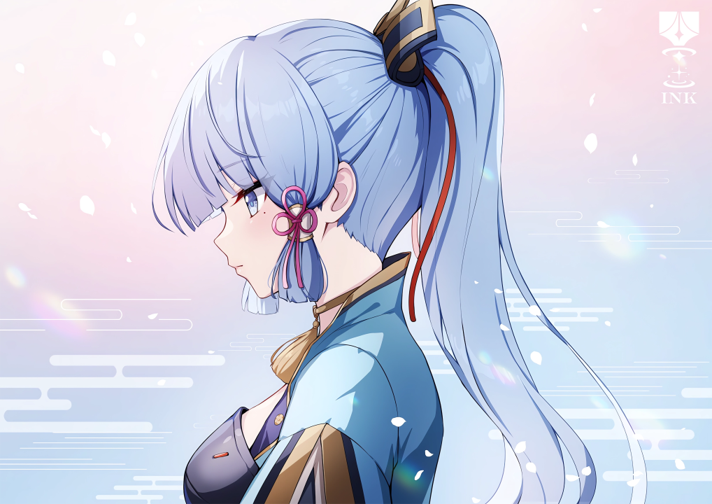长发、马尾辫、痣、泪痣、蓝色头发、蓝色眼睛、动漫、女孩、极简主义、简单背景、花瓣