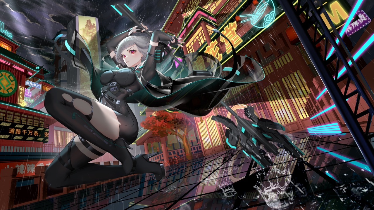 红眼睛、动漫、女孩、银发、雨、袜子、高跟鞋、武器