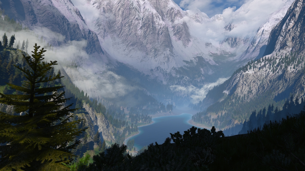 巫师狂猎、PC游戏、屏幕截图、山、湖、云、岩石、山谷